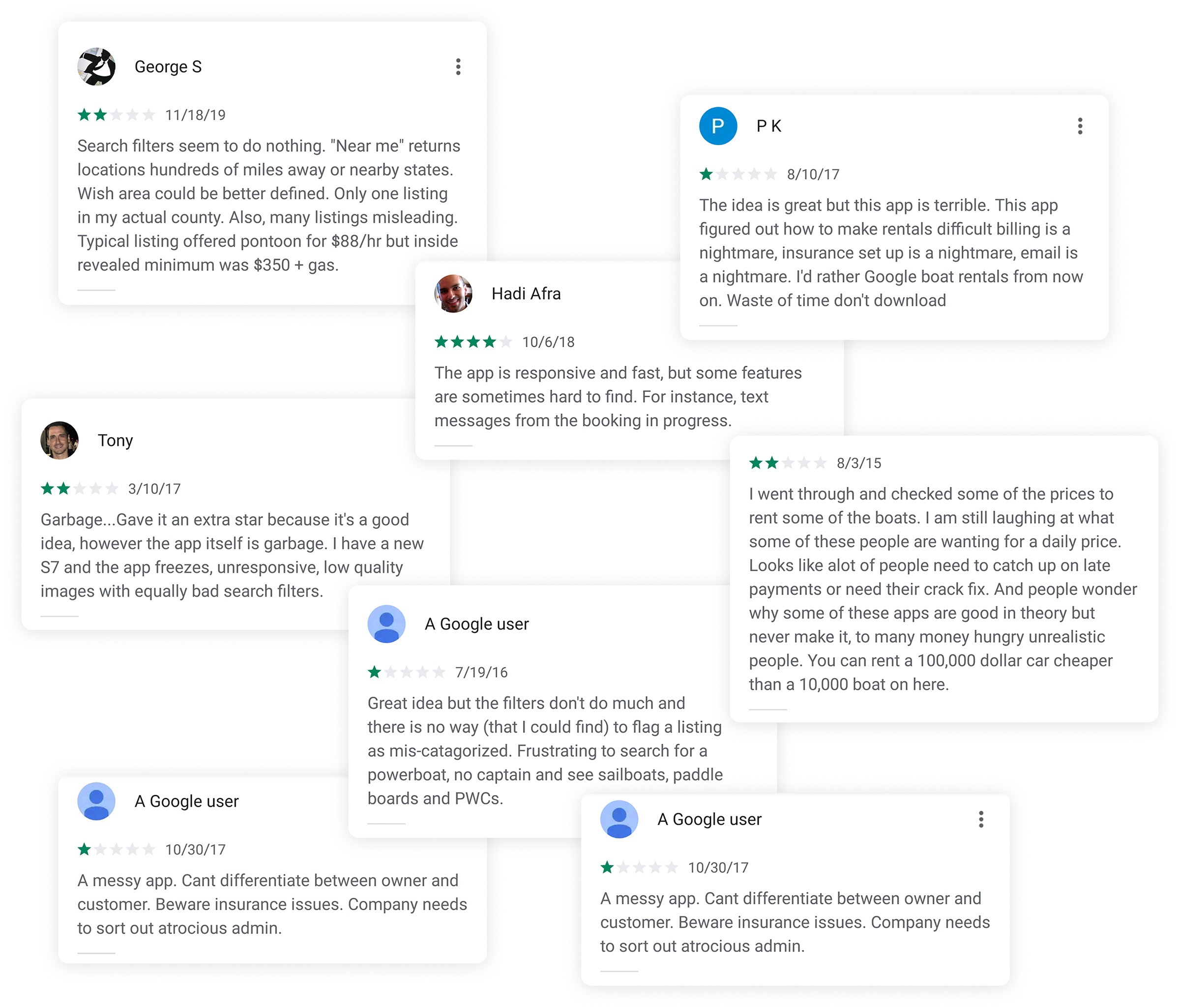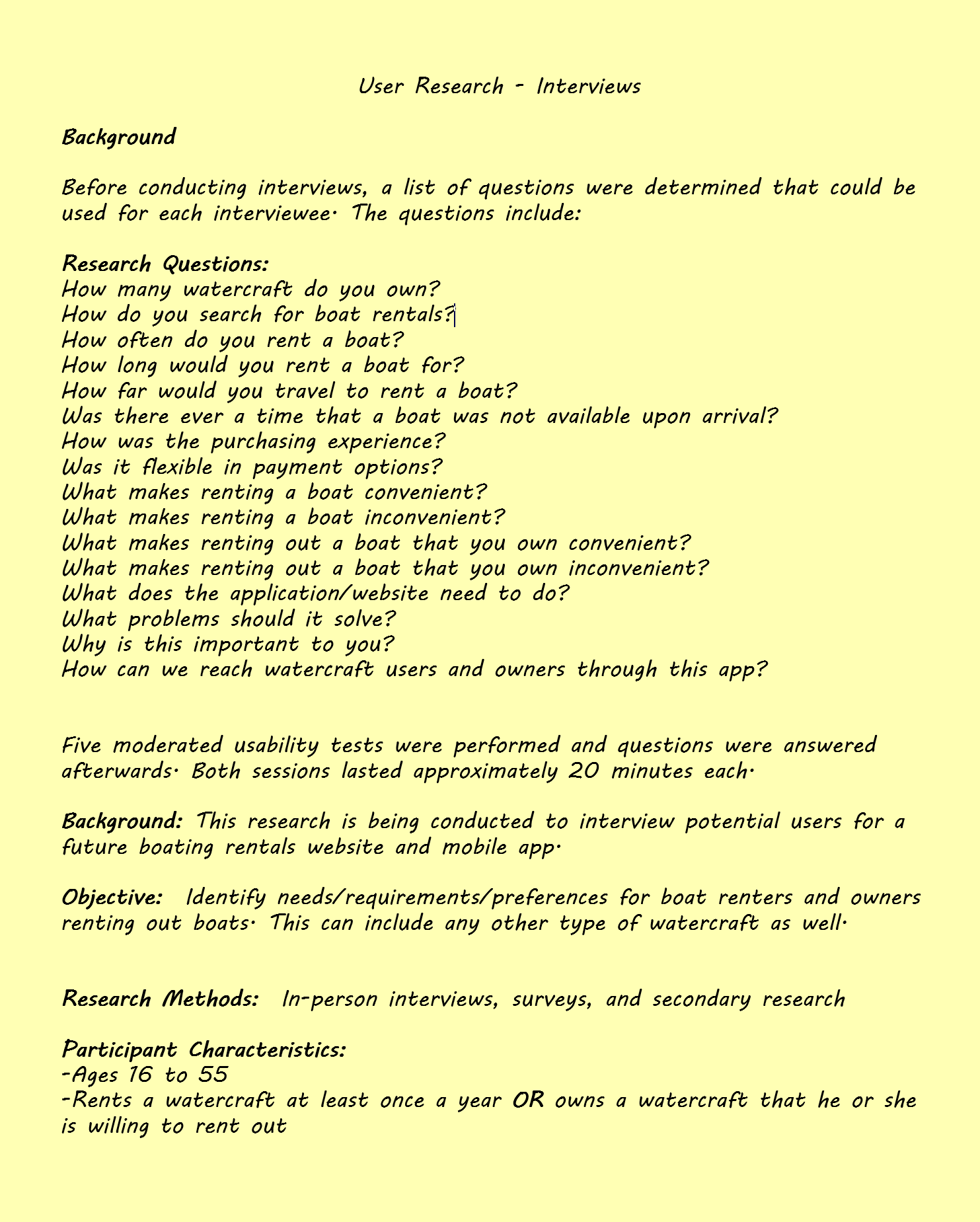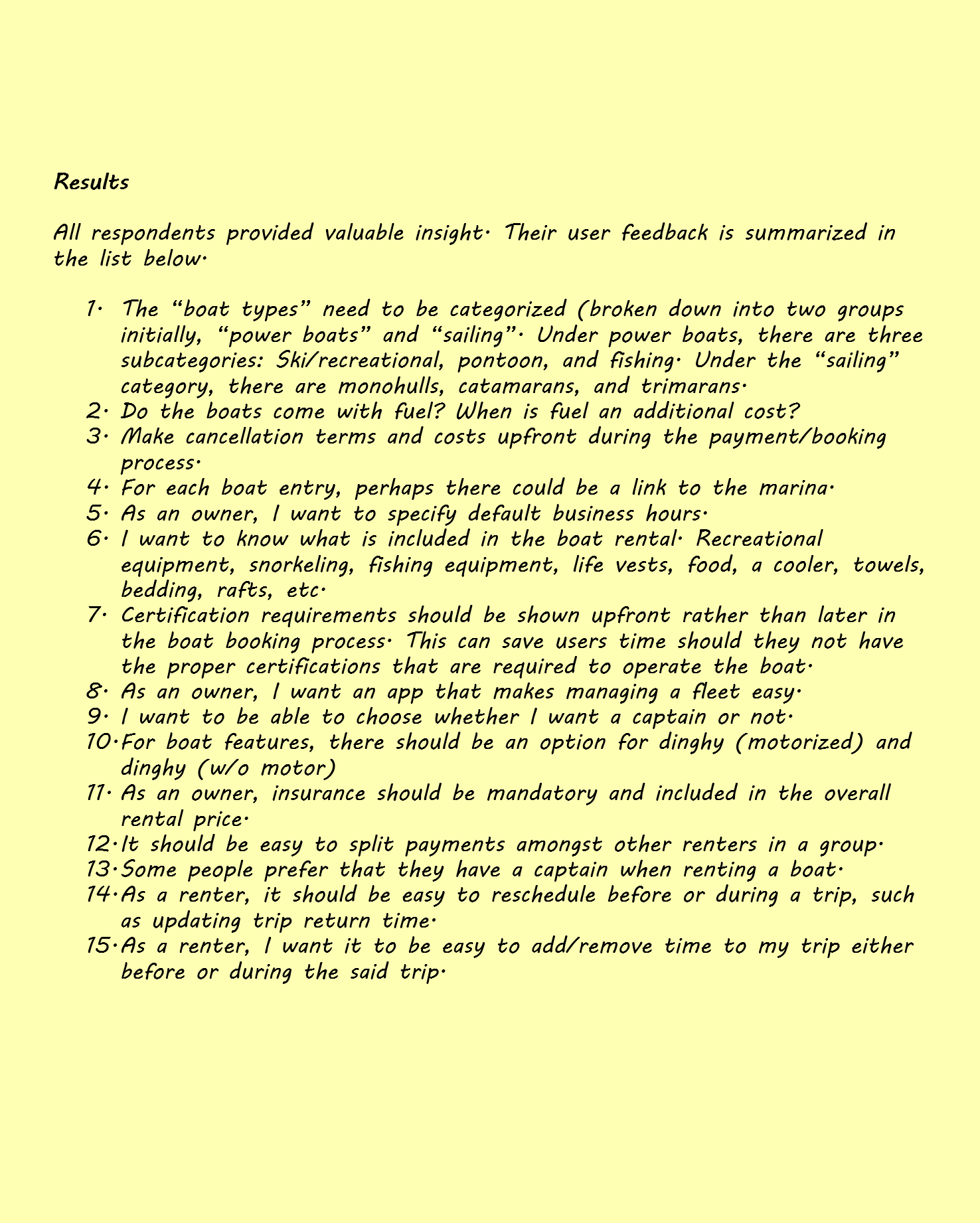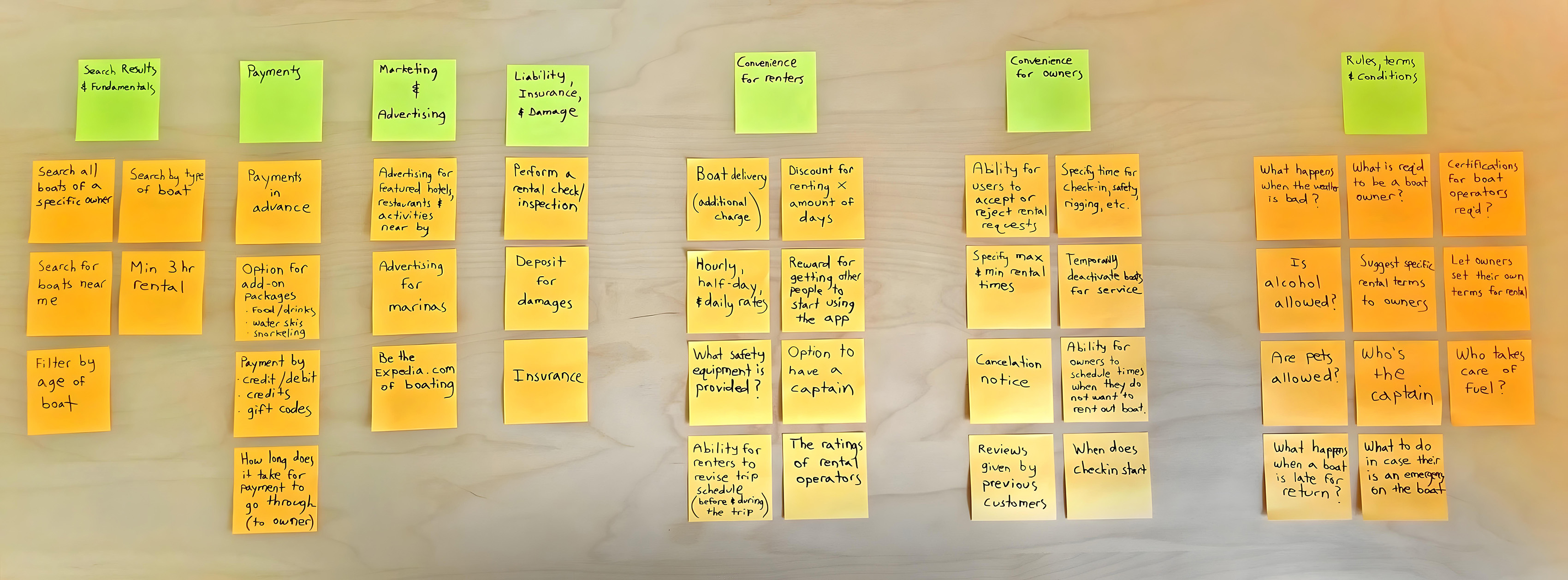 To make sense of the feedback I gathered from user interviews, I synthesized the findings into an affinity map—a visual tool that helped me organize and interpret recurring themes, pain points, and insights. I began by breaking down interview notes into discrete observations or quotes, each captured on a virtual sticky note. Then I grouped similar notes based on emerging themes—such as search results and fundamentals, payments, conveniences for boat renters and owners, as well as general rules and conditions.