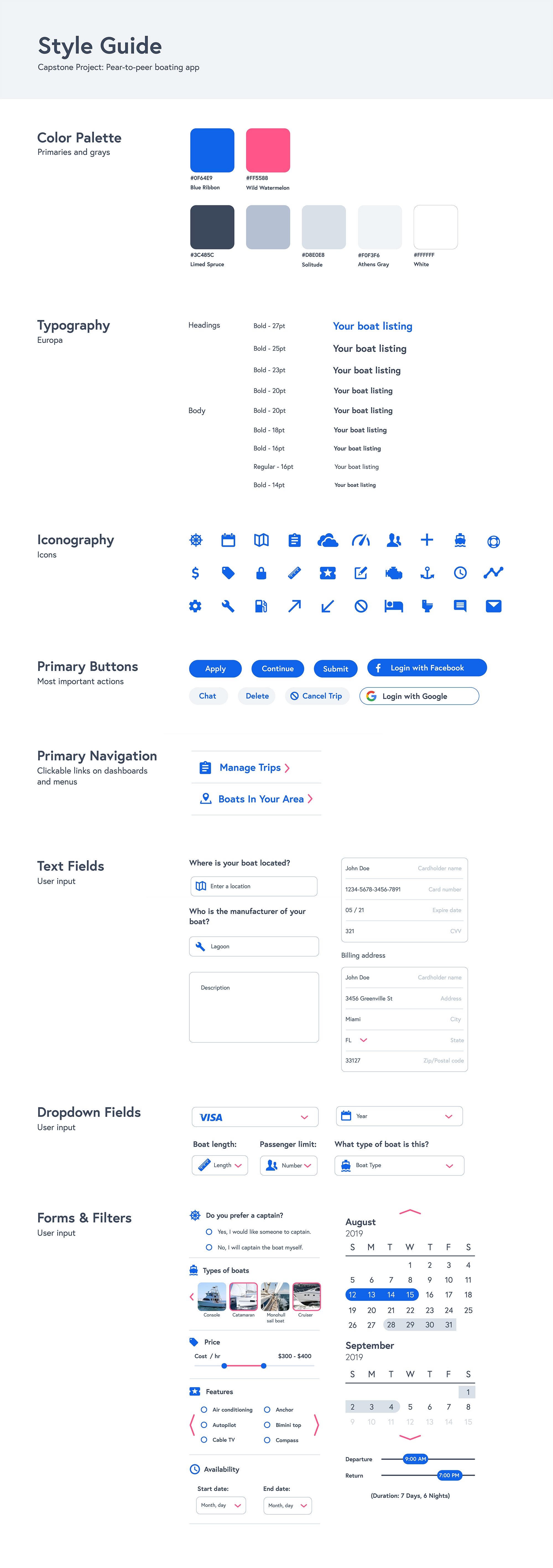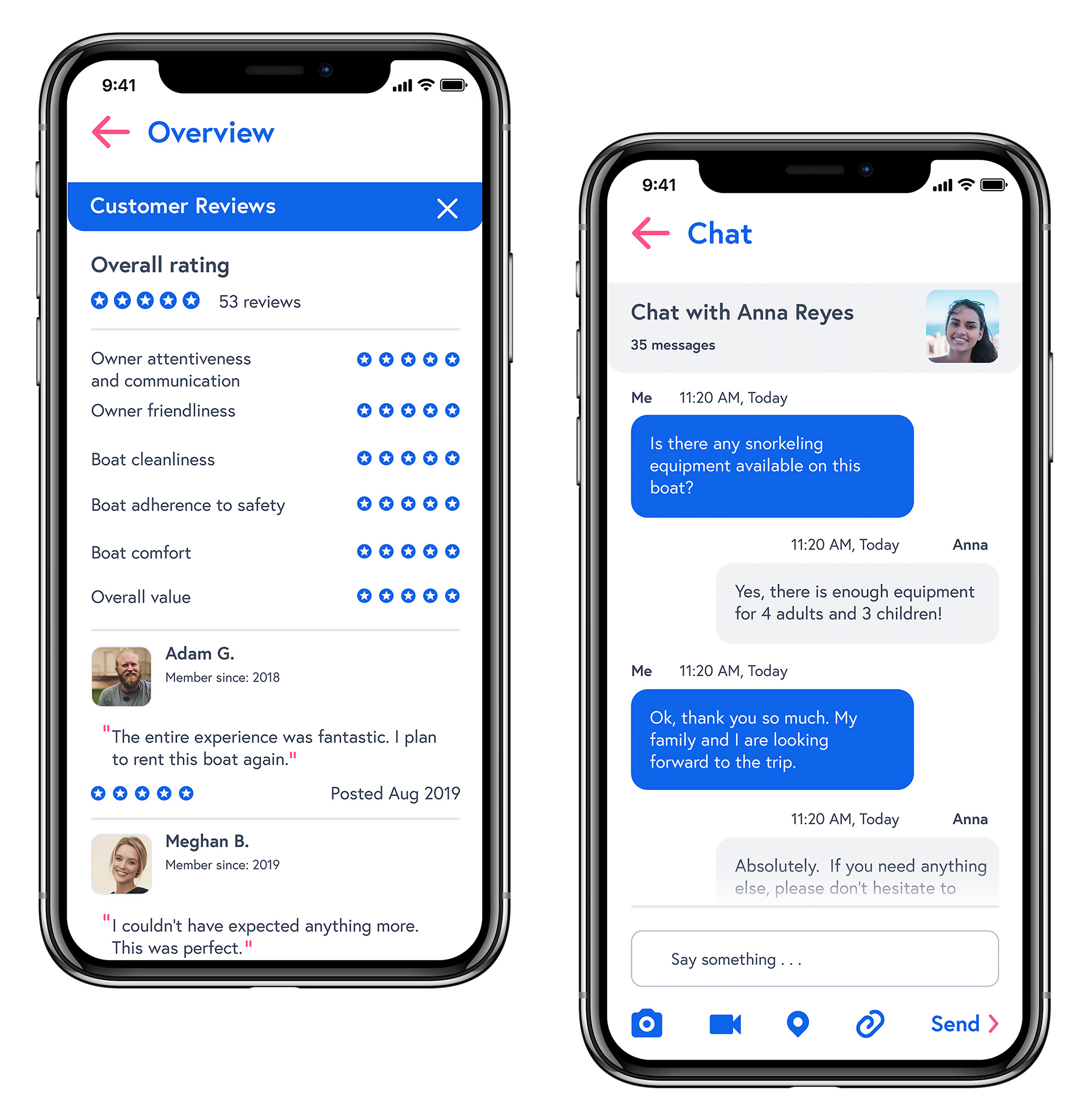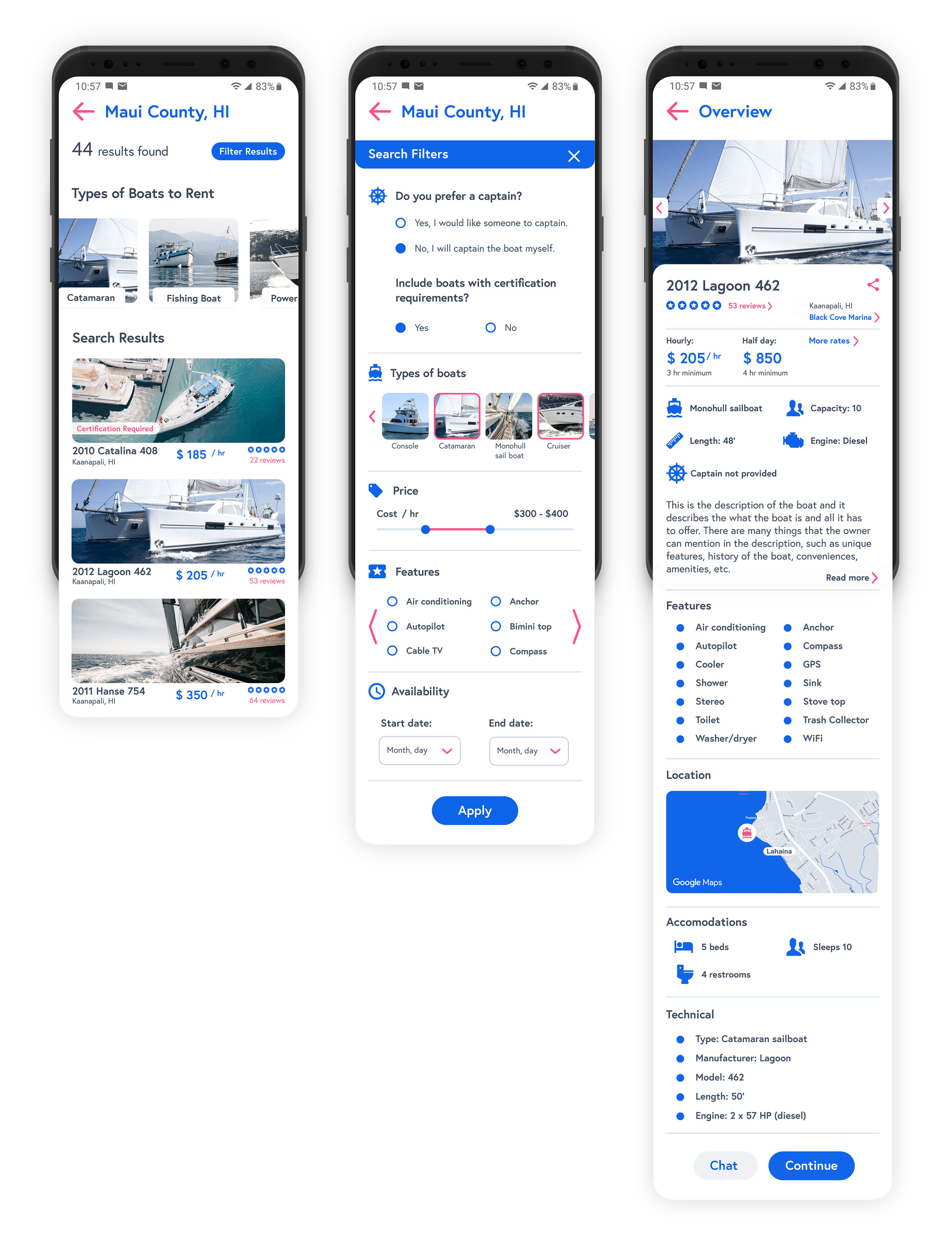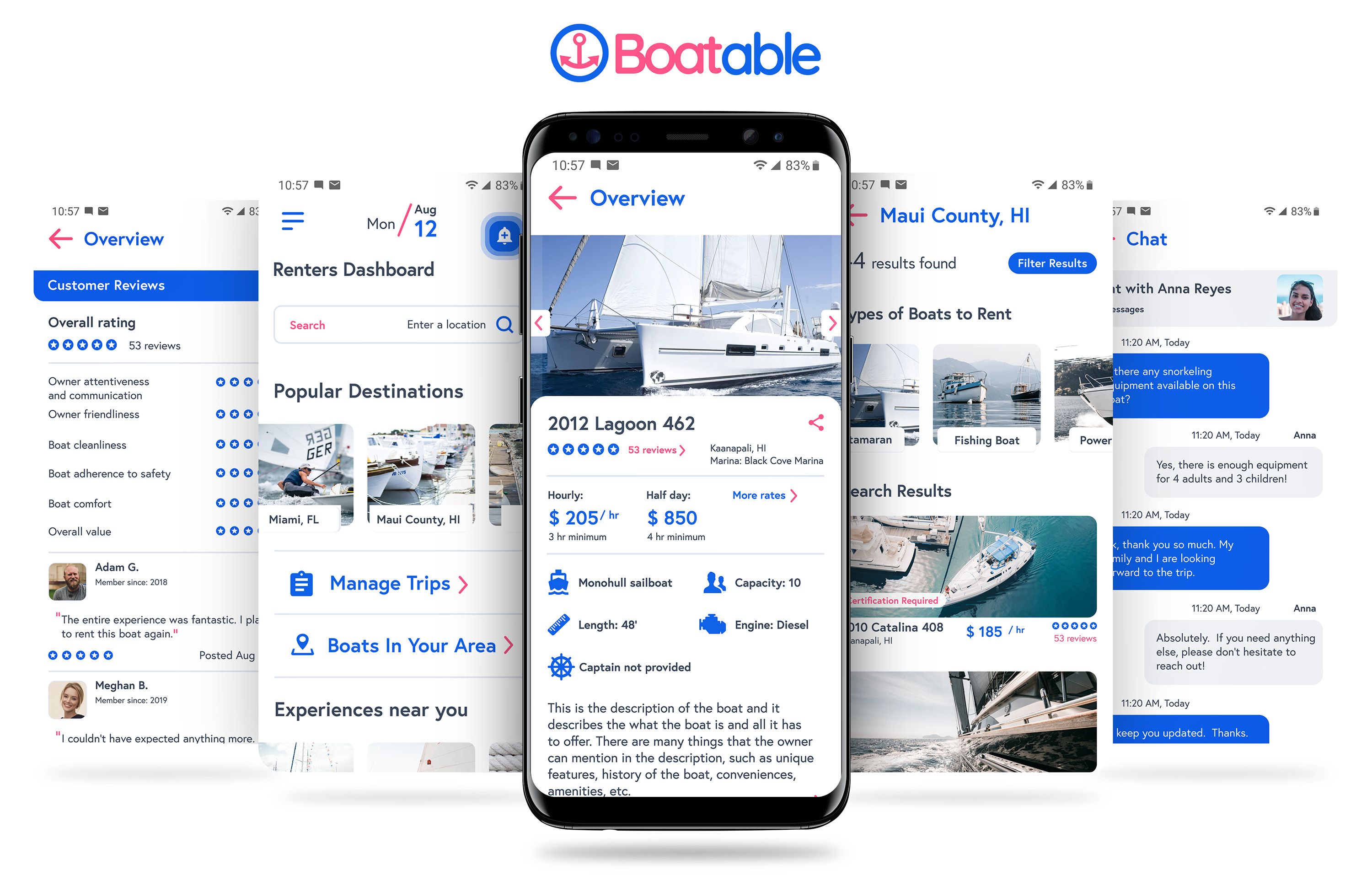 Having a solid brand and design system in place gave me the structure I needed to bring the app’s core screens to life. With consistent UI patterns, defined colors, and purposeful typography already established, I could focus on building interactions that felt natural and intuitive. Each screen was designed to reflect real user goals and behaviors—whether browsing boats or responding to a booking—while keeping the interface approachable and cohesive.
