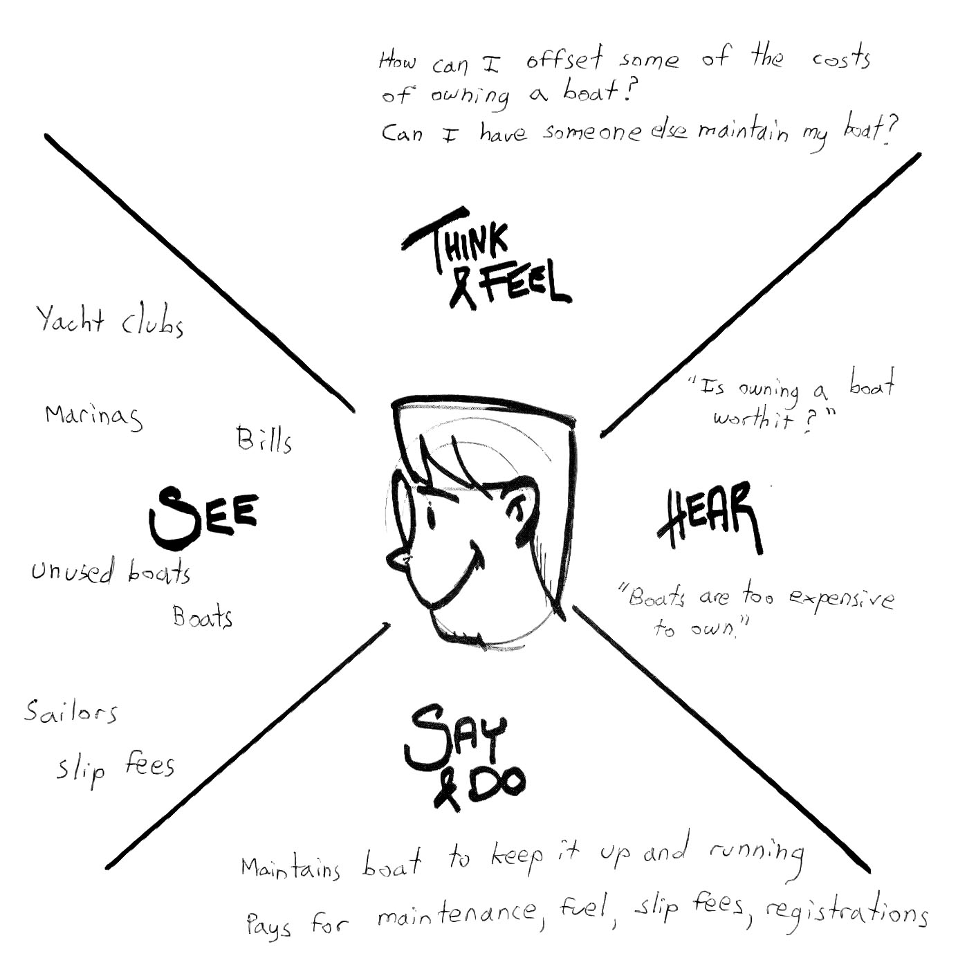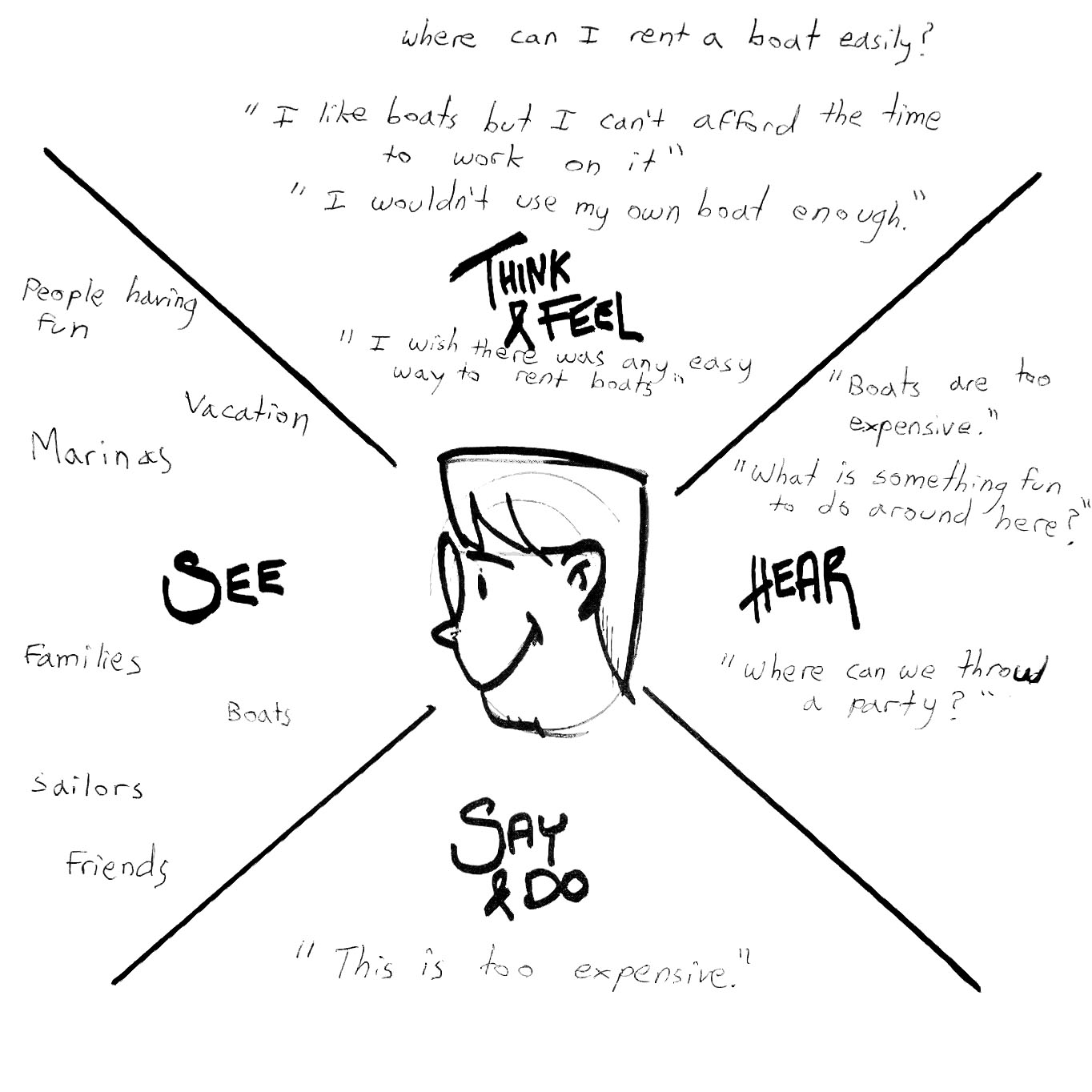 For boat renters, the empathy map revealed a common mindset: they love the idea of being out on the water, but not the long-term commitment that comes with owning a boat. Many voiced concerns like “Boats are too expensive,” or “I wouldn’t use one enough to justify buying it.” Others emphasized wanting the joy of the experience without the burden—“I don’t want to deal with maintenance; I just want to enjoy it when I have time.” For boat owners, the empathy map highlighted concerns around liability, overhead costs, and long periods of time without use. They wanted reassurance, control, and streamlined tools to manage listings without constant back-and-forth. These insights underscored a strong desire for flexibility, affordability, and hassle-free access. The empathy map helped crystallize what renters and owners were truly seeking: a simple, low-pressure way to connect with the water—without owning an anchor of responsibility.