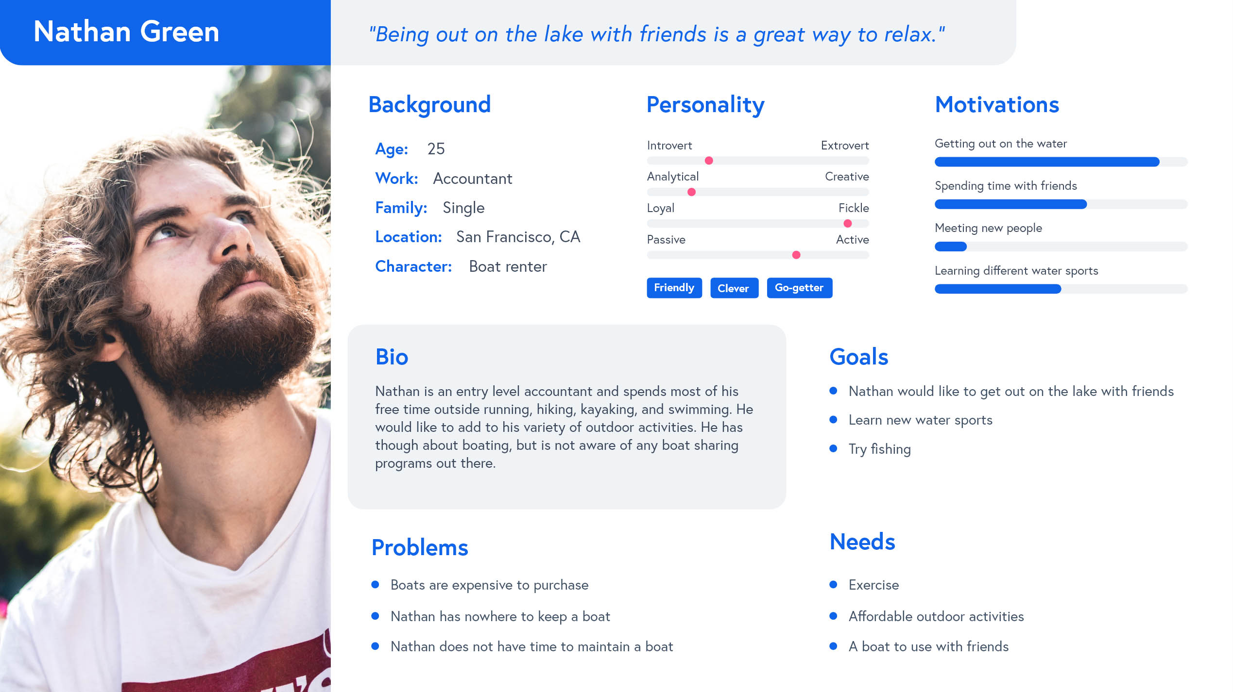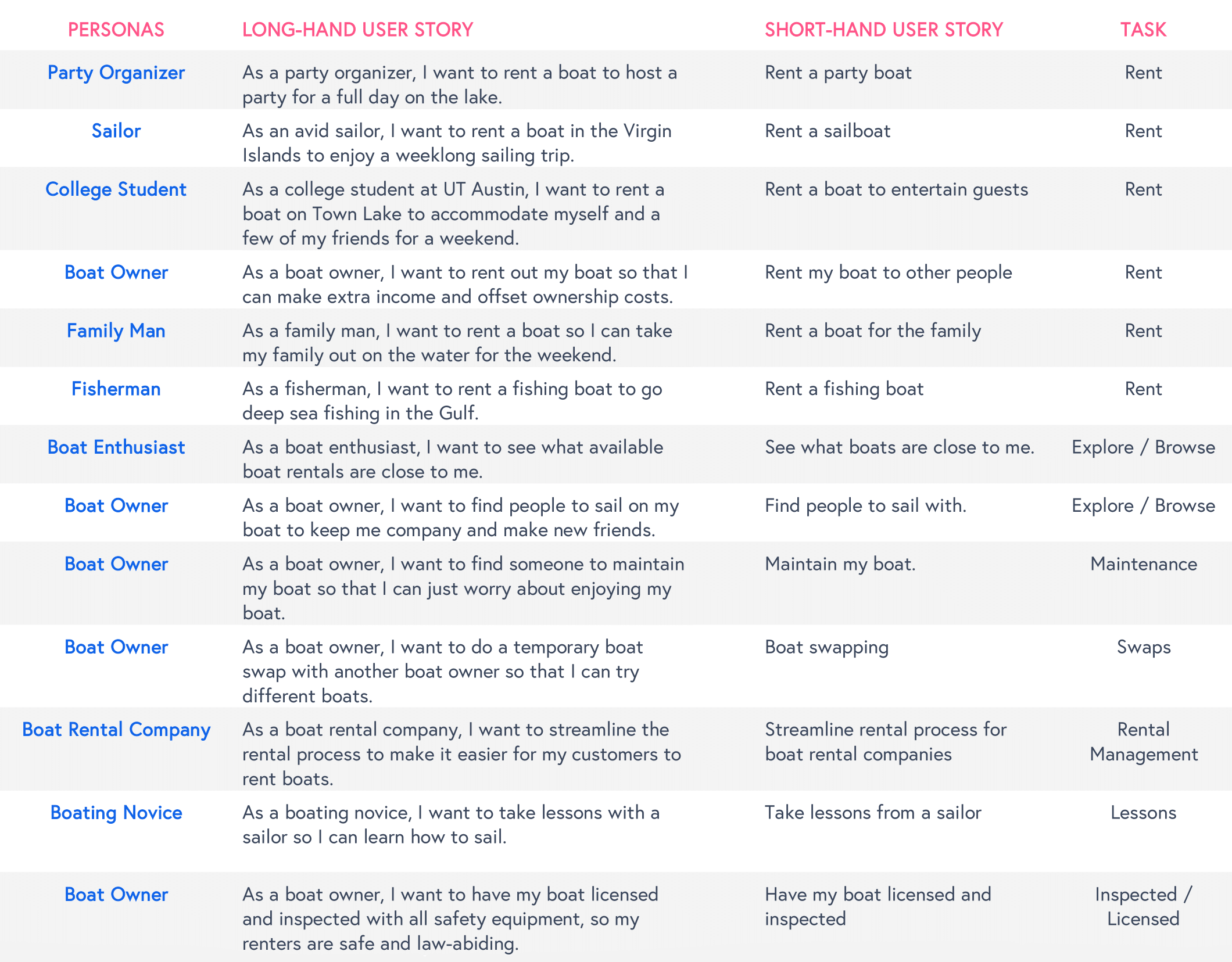 Based on well-defined empathy maps, I crafted user stories that represented the distinct goals of key personas. For renters, I covered a range of use cases—from party organizers planning group outings, to college students seeking budget-friendly options, to fishermen, sailors, and families, each with their own priorities. On the owner side, I focused on individuals looking to offset boat ownership costs and rental companies aiming to streamline listings and communication. These stories helped prioritize features and informed a user experience rooted in real-world behaviors.