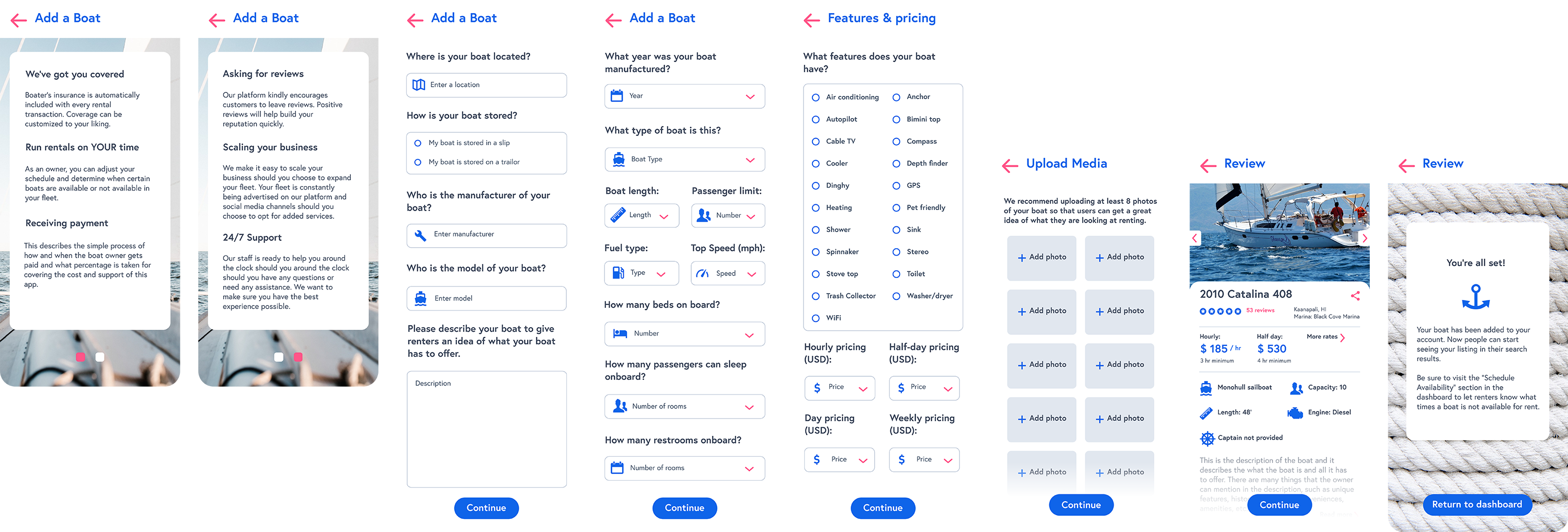 To help boat owners attract renters and build trust, I designed a listing flow that made it easy to create detailed, appealing profiles for each boat. User research showed renters prioritized transparency, so listings captured everything from pricing and sleeping accommodations to onboard amenities like GPS, coolers, and paddleboards. The UI walked owners through each step—surfacing the right details at the right time—so they could showcase what made their boat stand out while giving renters the clarity they needed to book with confidence.