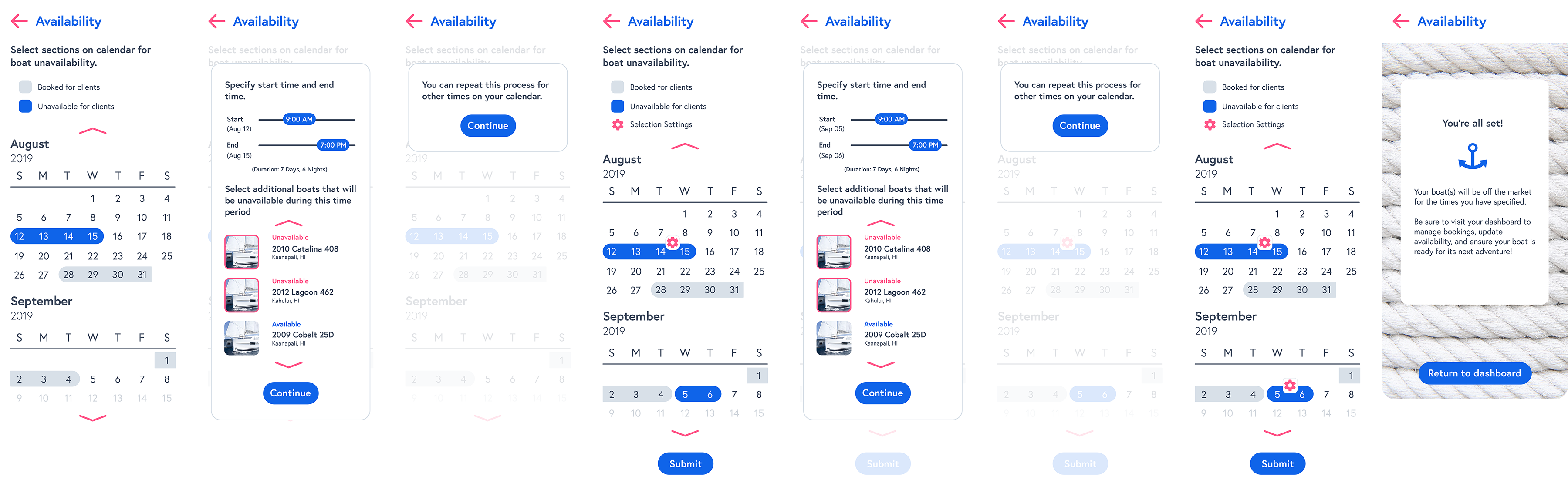 Designing an availability scheduling system for boat owners meant creating an experience that felt less like admin work and more like a streamlined control panel for their business. I designed the boat availability experience with scalability, clarity, and control in mind—ensuring it could accommodate both casual owners and high-volume operators. The scheduling system allowed owners to define availability on a per-boat basis with flexible time blocks, including support for multiple daily windows and granular durations. Rather than forcing rigid scheduling templates, I prioritized open-ended input, enabling owners with the flexibility that they needed.