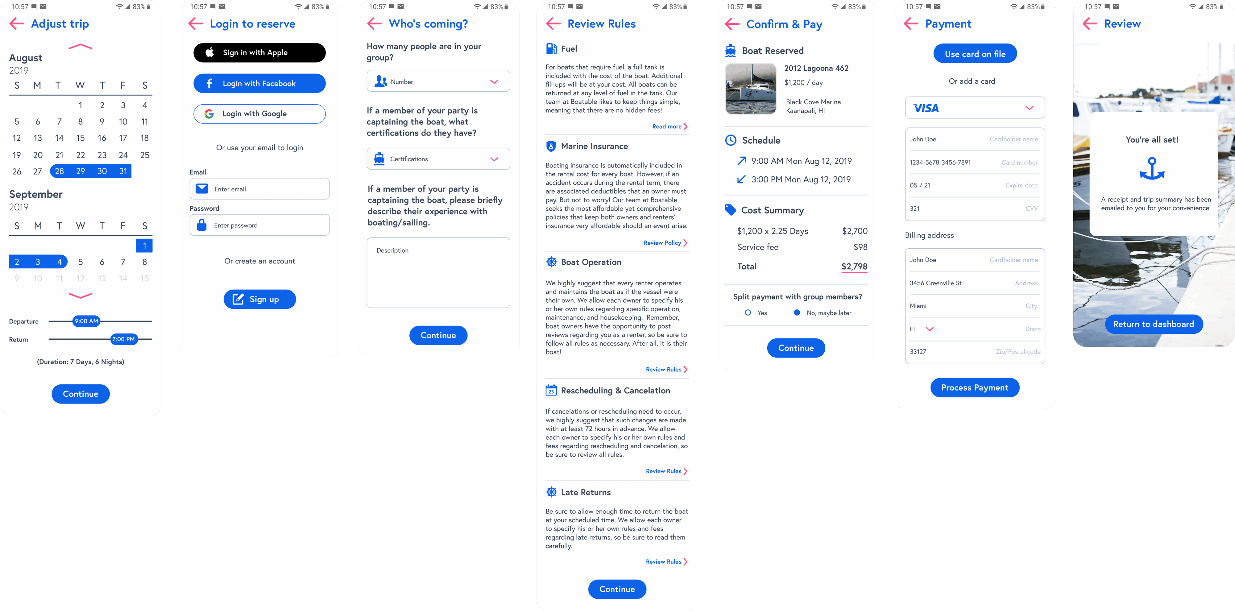 I designed the app’s onboarding flow with a focus on simplicity, flexibility, and user autonomy. Rather than gating the experience behind a registration wall, I allowed users to dive straight into exploring listings the moment they opened the app. Onboarding didn’t begin until they found a boat they were actually interested in booking—a deliberate choice that respected their time and lowered the barrier to engagement. This approach offered a smoother, more welcoming entry point, giving users the freedom to browse and build trust before being asked to create an account or enter details.