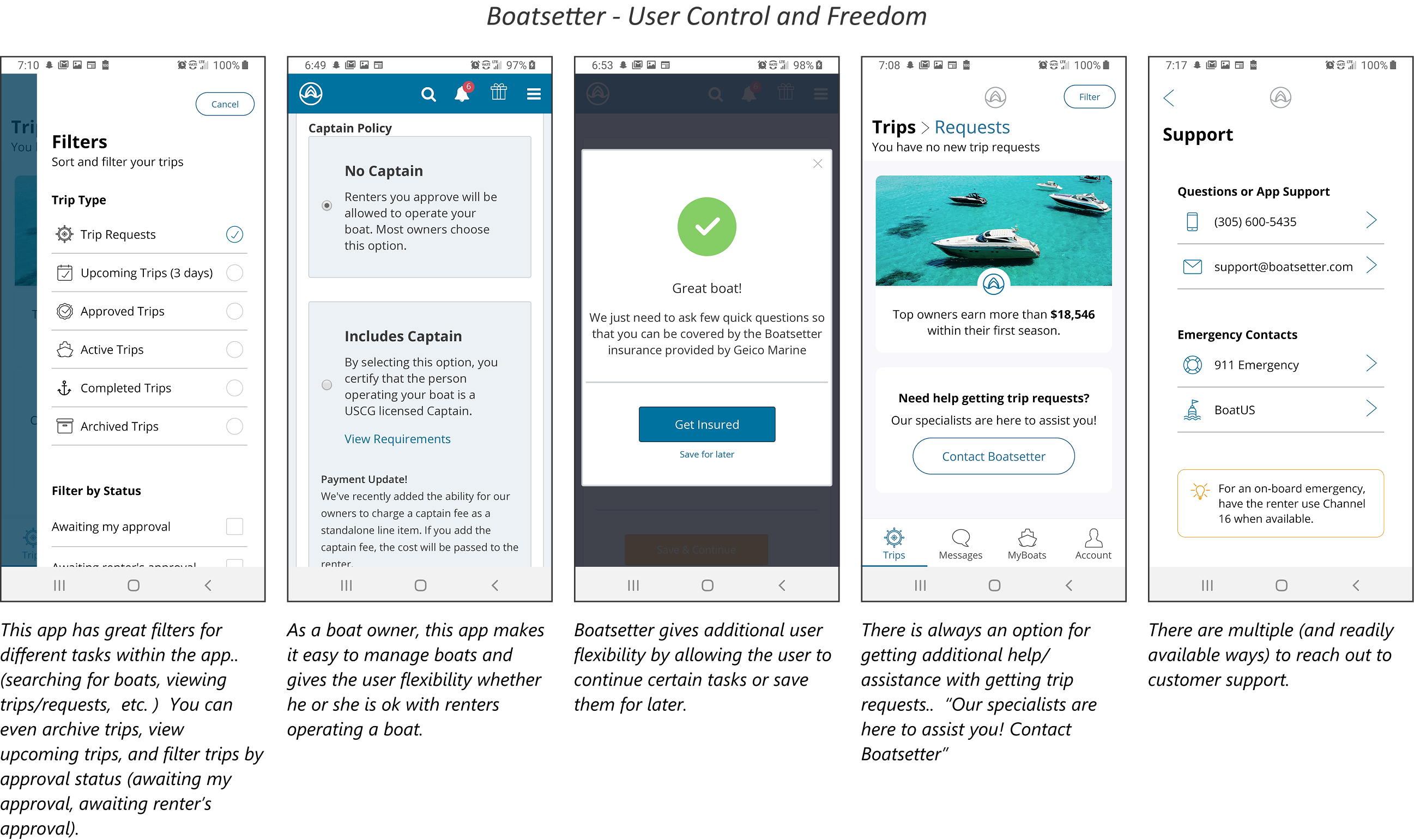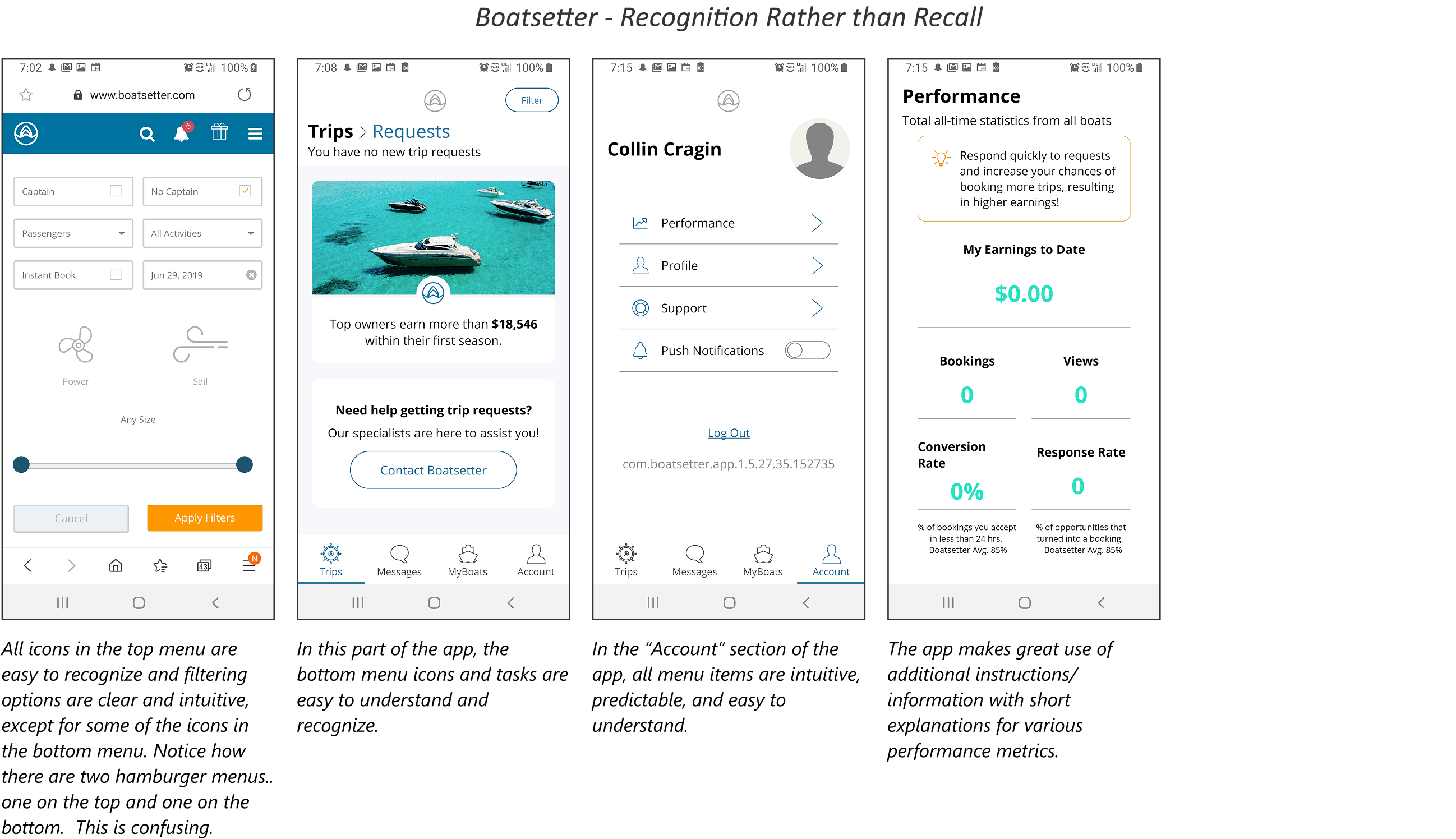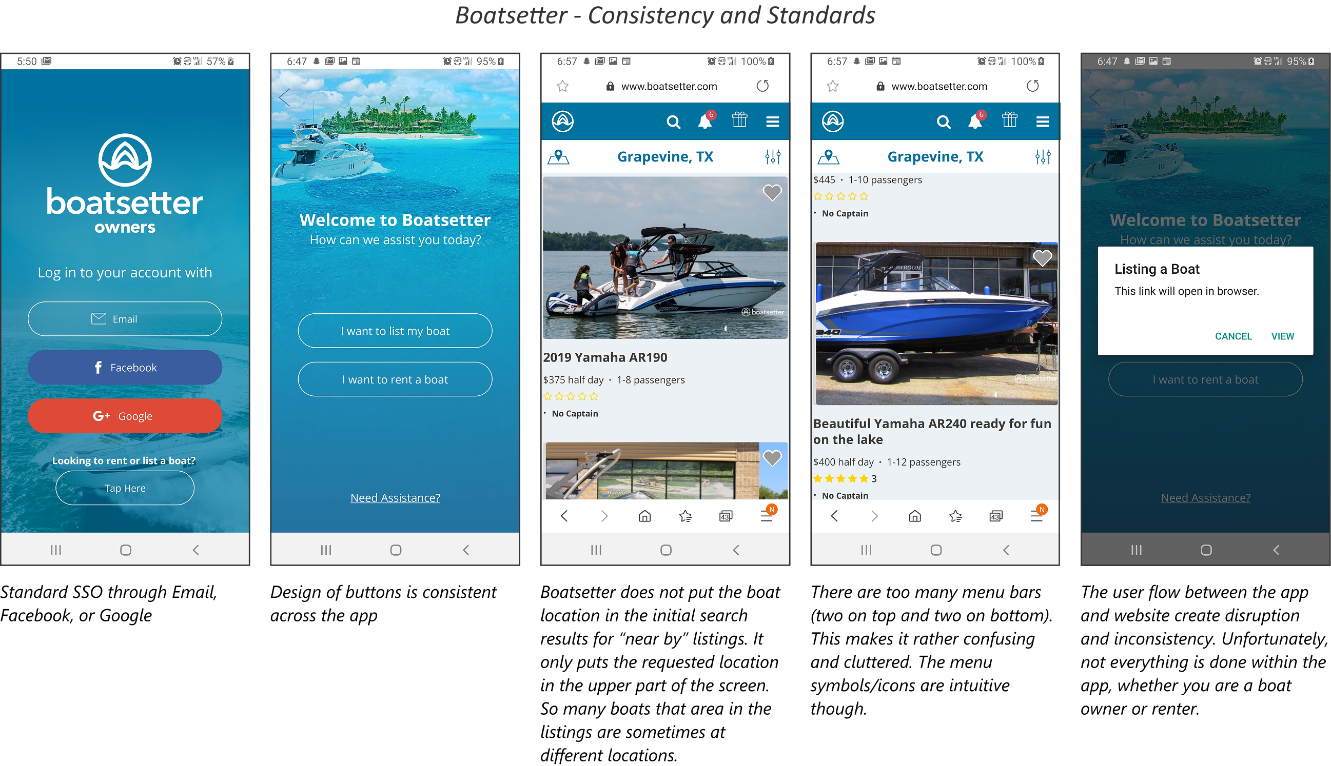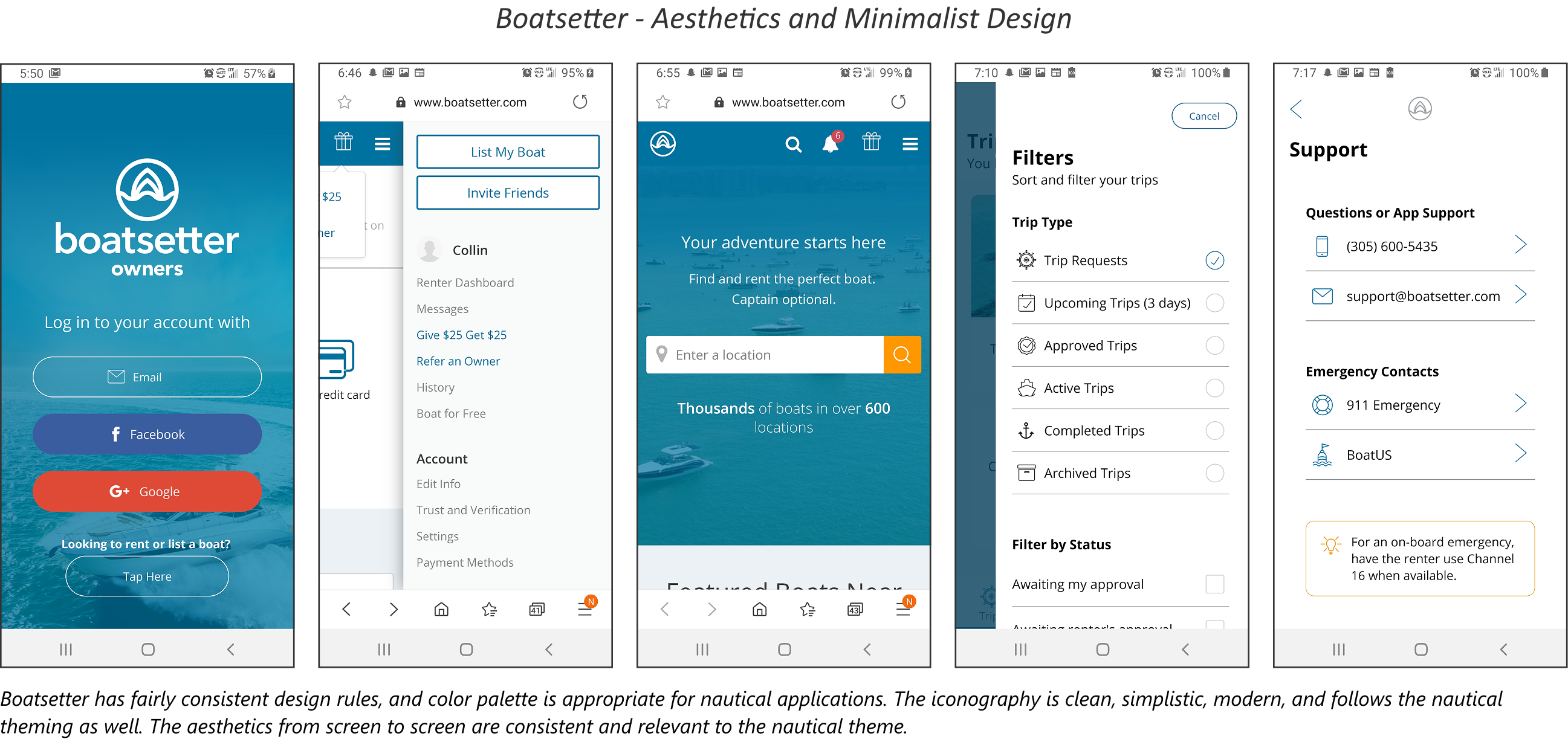 Diving deeper into competitive analysis, I conducted a heuristic evaluation of Boatsetter, Get My Boat, and Click&Boat, the most popular boating apps, to better understand how well each app meets established usability standards. Using Jakob Nielsen’s ten usability heuristics as a lens—like consistency and standards, error prevention, and recognition rather than recall—I critically examined the app’s user interface, navigation, and overall functionality. This approach allowed me to spot areas where the app excelled, like its clear visual hierarchy and booking flow, as well as places where it could be more intuitive or efficient.