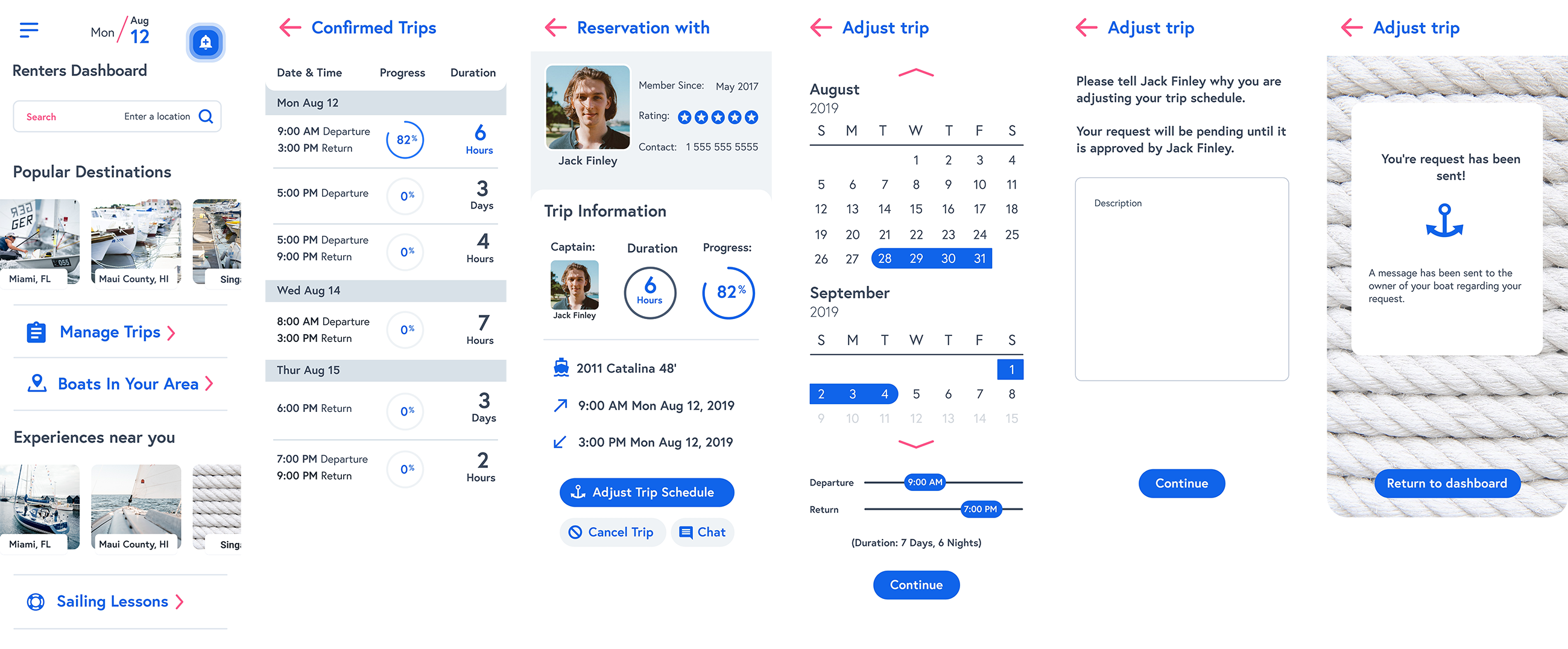 One of the recurring pain points I uncovered during research was how rigid and unforgiving the booking systems were on existing boat rental platforms. Renters often felt boxed in—unable to make changes once a trip was booked, and unsure how to communicate needs without starting over or jumping through hoops. I addressed this by designing a flexible and responsive trip management experience. Renters could easily modify key aspects of their bookings: extend an active trip if the day was going well, message the owner with last-minute questions or requests, reschedule a future outing if weather or plans changed, or cancel a booking altogether if necessary. Each option was accessible through a single, centralized trip dashboard—minimizing confusion and putting users in control.