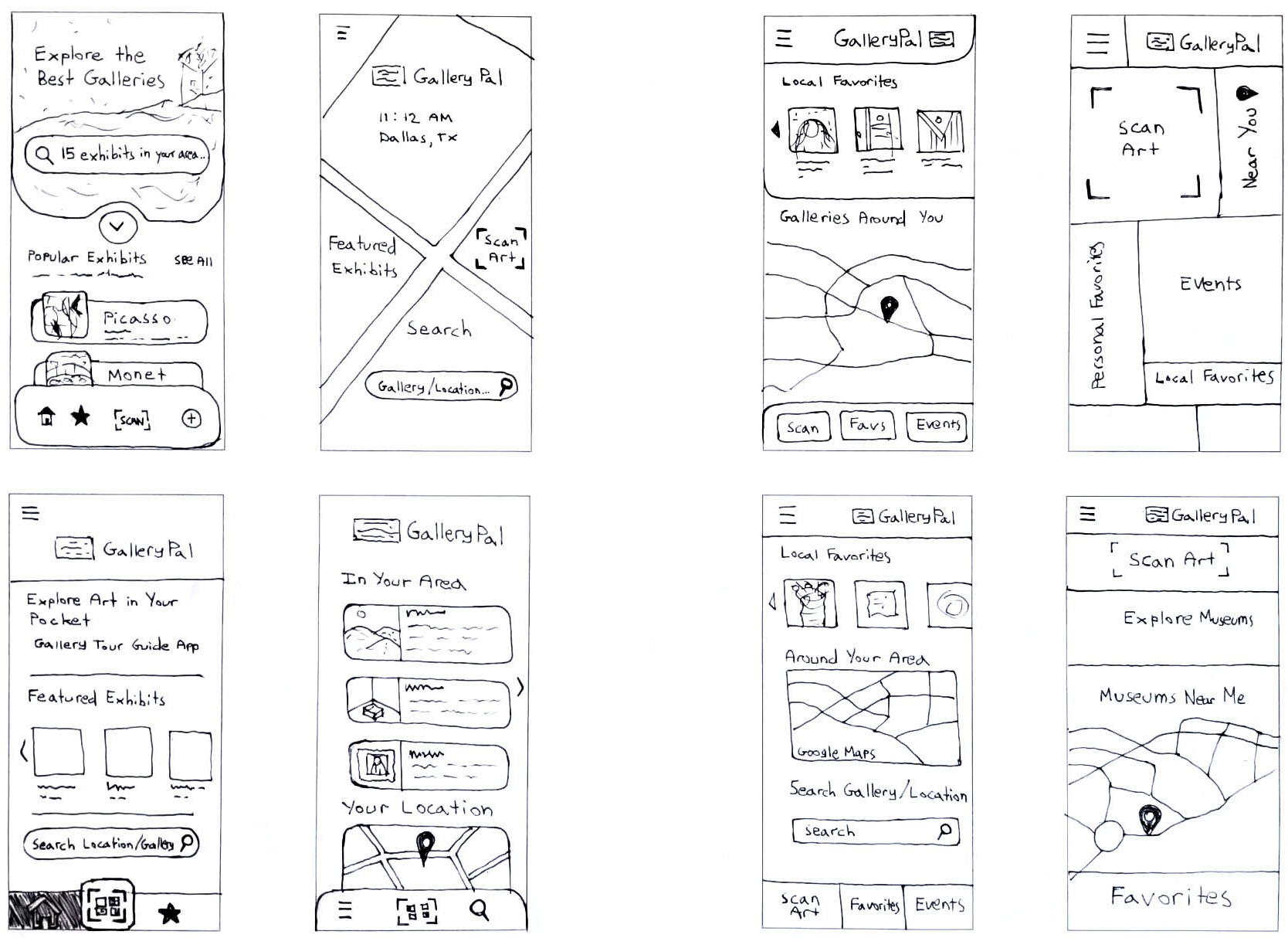 After reviewing my journey maps, it became clear that the landing page was key to solving the core user challenge. This screen offers quick, intuitive access to nearby museums, current exhibits, and specific artworks—designed to spark curiosity without overwhelming the user. It serves as a central hub both before and after viewing art, helping visitors feel inspired and informed without feeling rushed. Recognizing the importance of this interaction, I explored layout ideas through a Crazy 8s sketch session, generating eight screen iterations in just eight minutes.