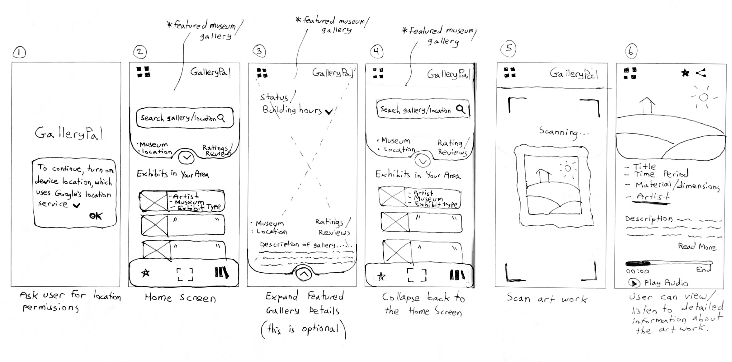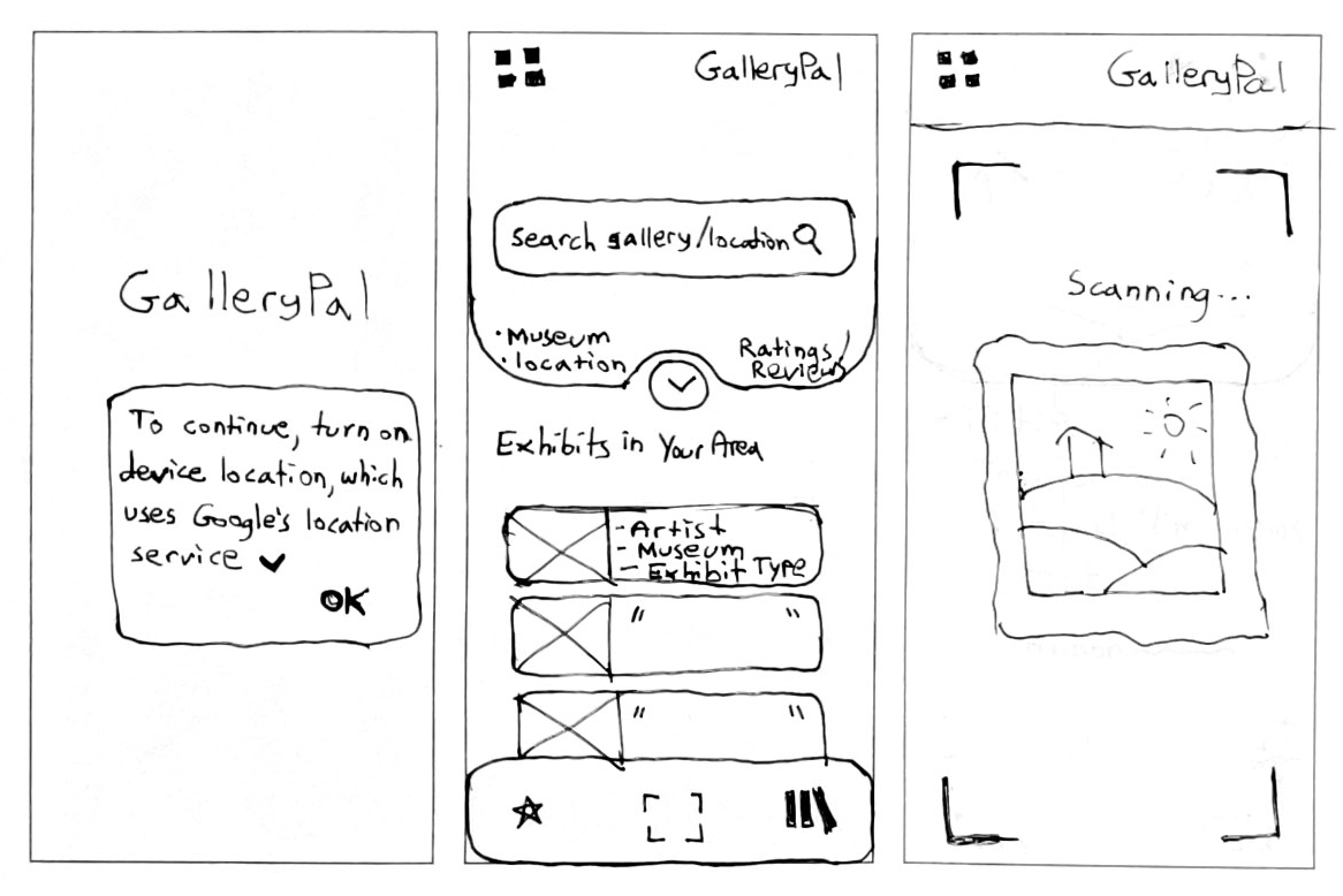 I created another solution sketch below to show how the design of the original solution sketch would function when a user is at the museum and decides to scan the artwork for more information. After the user provides geolocation permissions, only a single click is needed to activate the scanning feature.