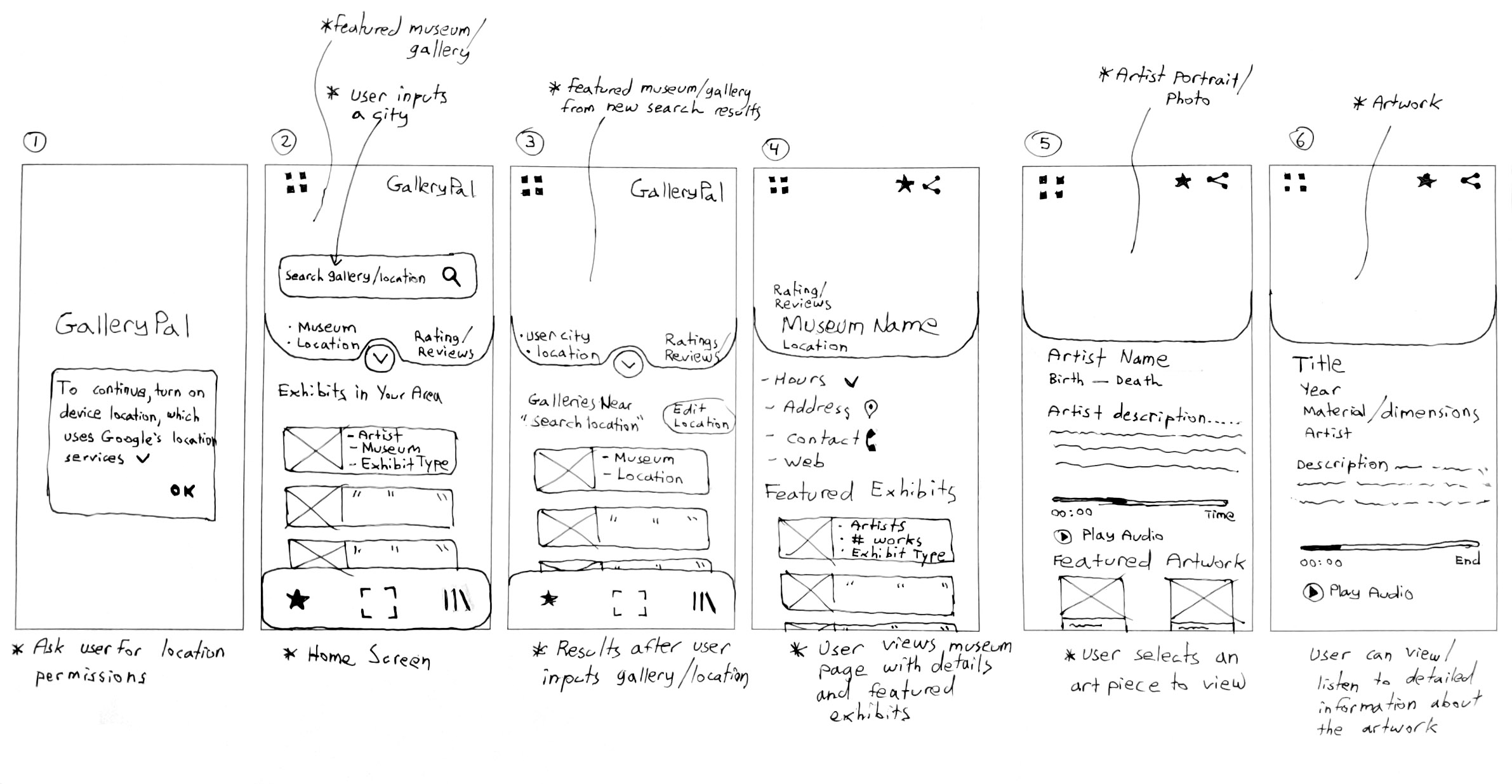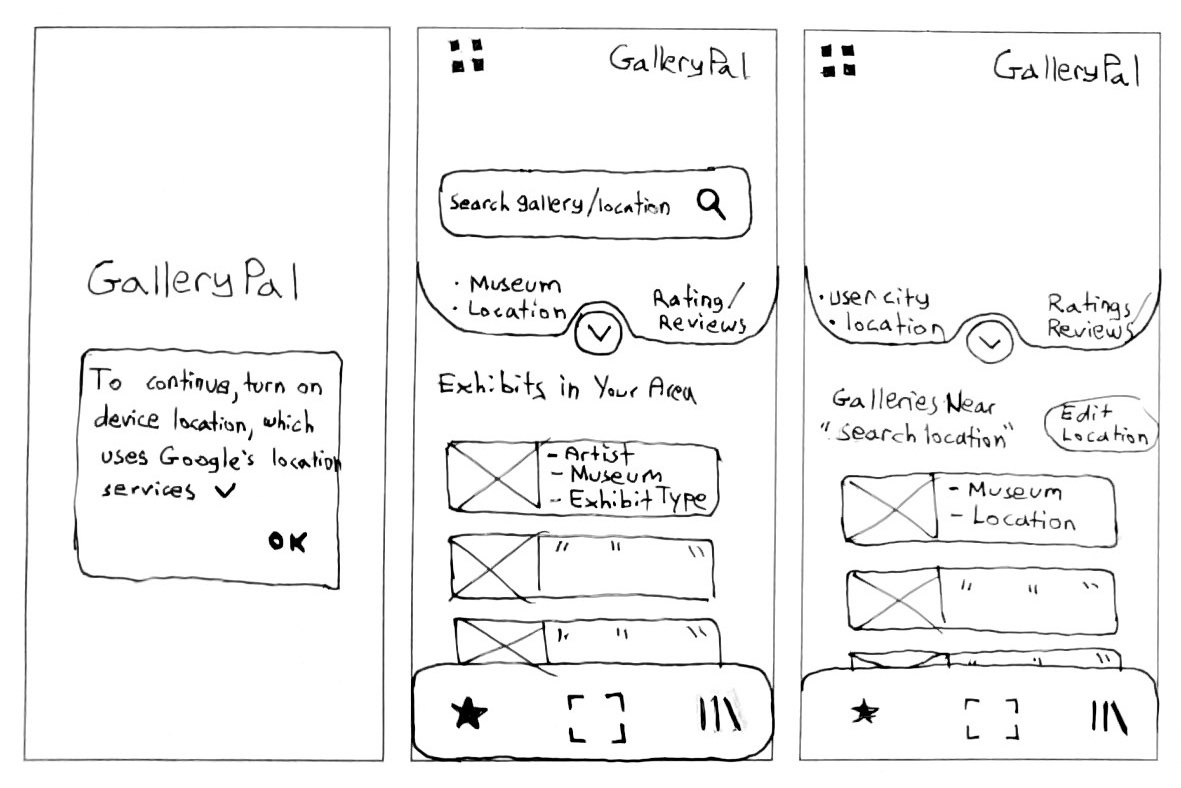 I selected the first sketch to develop into a a solution sketch as shown below—a three-panel layout showcasing the critical screen along with its preceding and following states. This first sketch above was chosen for its ability to deliver immediate results for local art exhibits and museums, while efficiently incorporating key actions like scanning artwork, viewing saved pieces, and navigating favorites. Its layout made the most effective use of screen real estate, prioritizing visibility to community favorites and popular exhibits near the user’s geolocation. This would allow users to quickly review artwork ahead of time, but also provide the user multiple entry points for finding the artwork they are actively viewing in the museum or gallery.