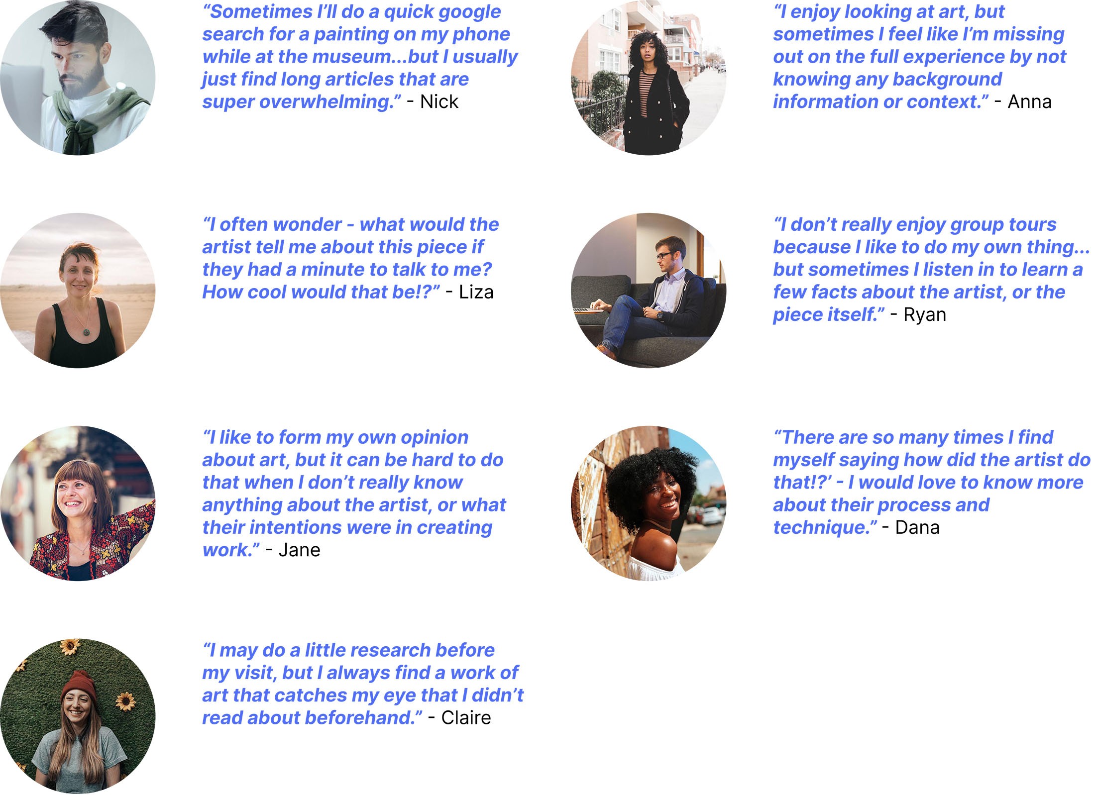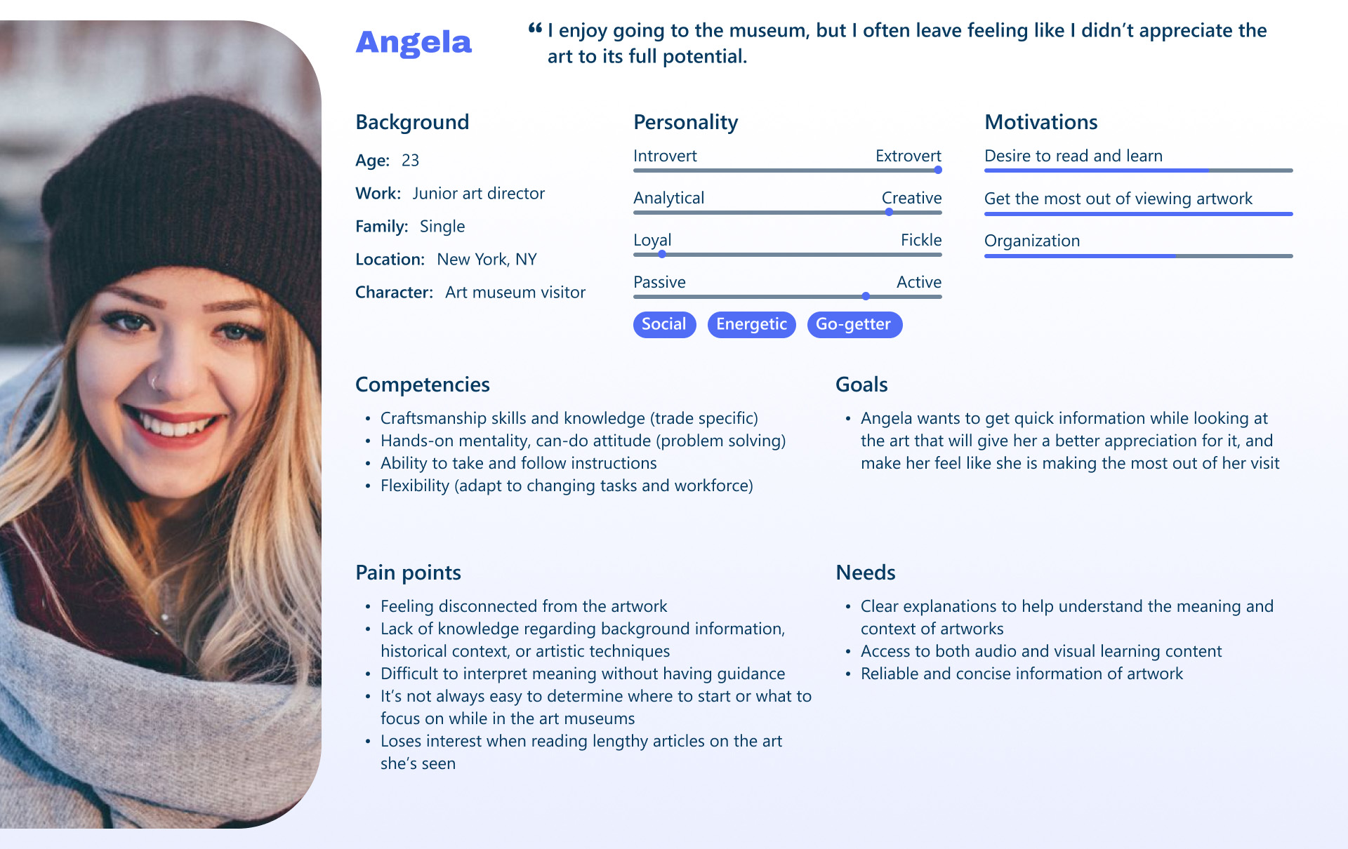 Furthermore, I used the research data that was given to me to create a more comprehensive persona. Angela is a 23-year-old junior art director living in New York City who regularly visits top museums out of personal interest, often going solo. While she enjoys these visits, she frequently leaves feeling like she hasn’t fully appreciated the artwork. Long, in-depth texts don’t hold her attention, but she craves quick, accessible insights that would enrich her experience and make each visit feel more worthwhile.