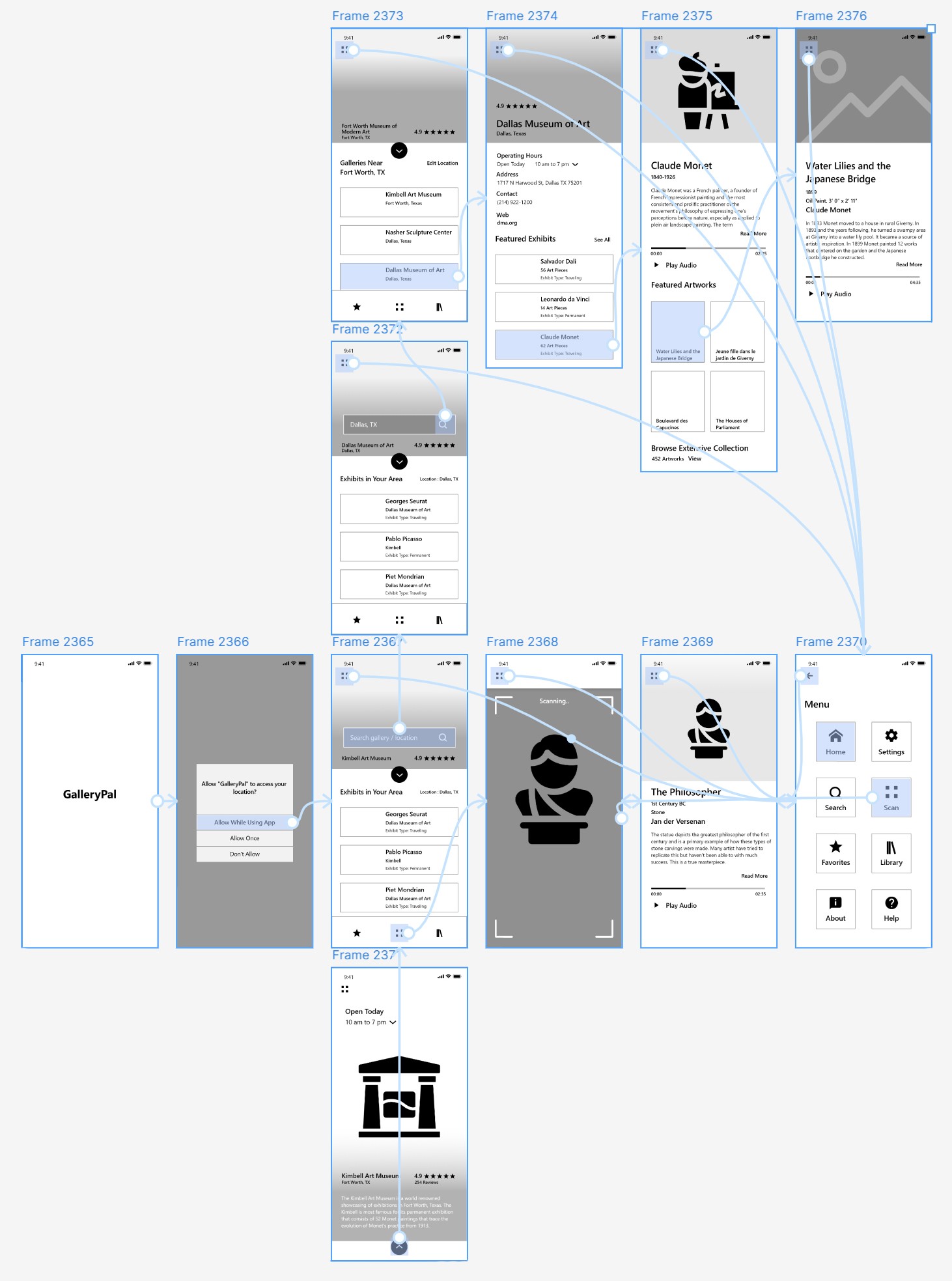 The flow below illustrates the screens I designed for the first phase of the clickable prototype. It focuses on assessing usability and collecting feedback on the process of locating a specific art museum, navigating its featured exhibit, and exploring a painting of interest.